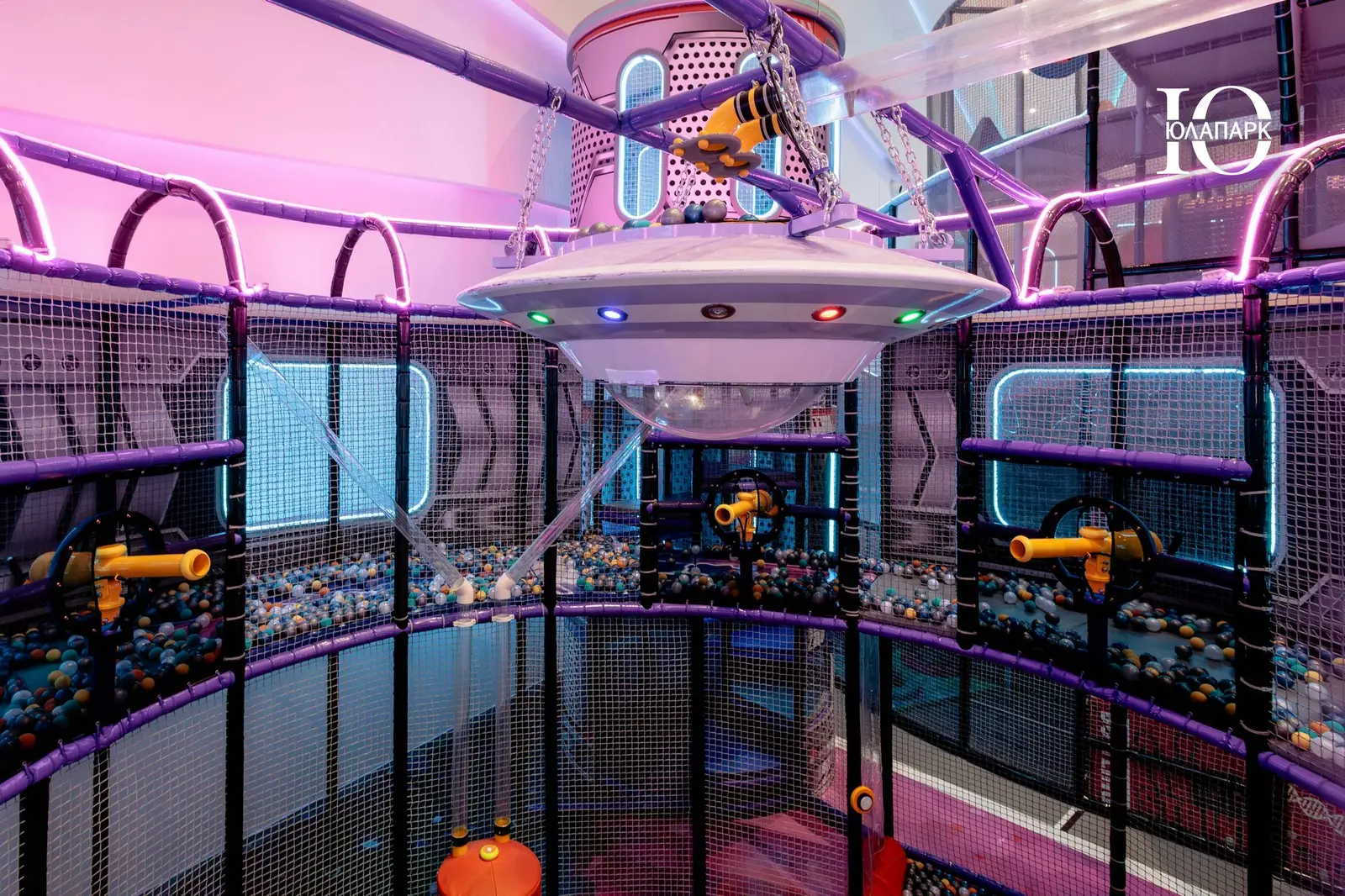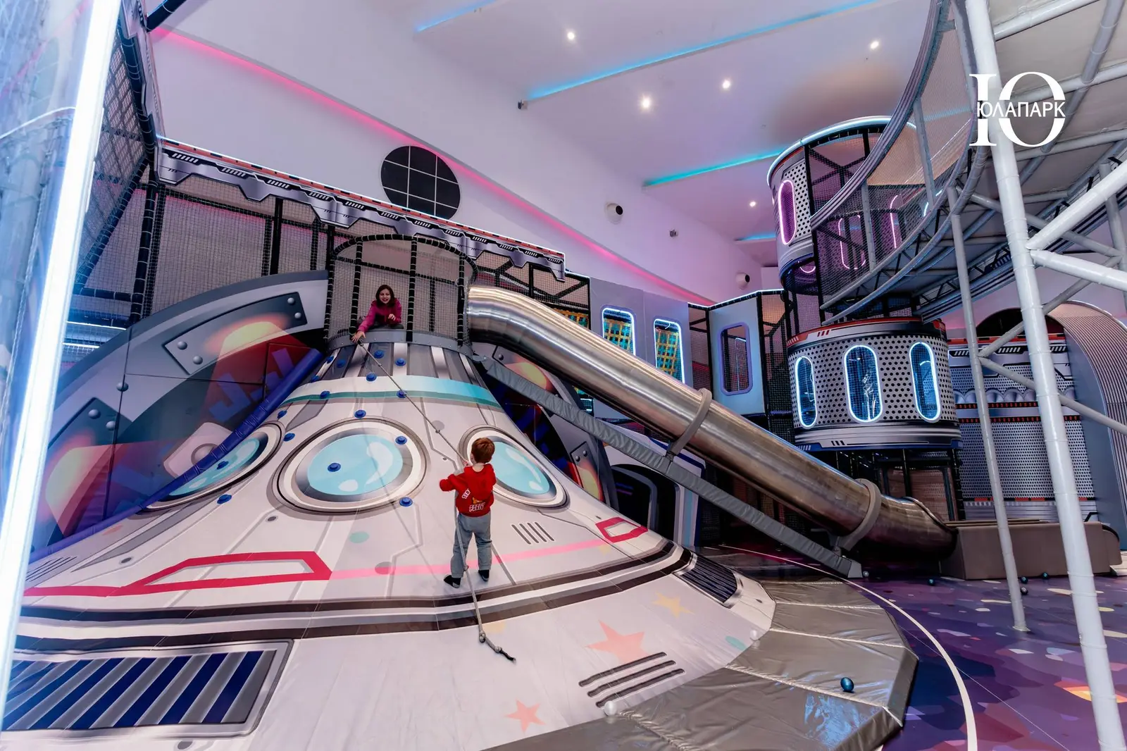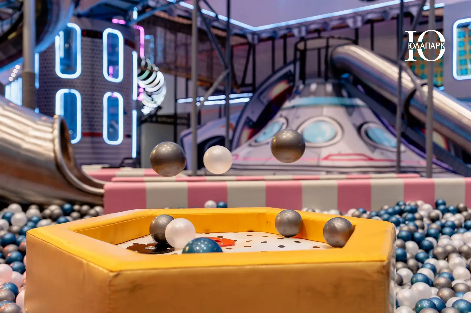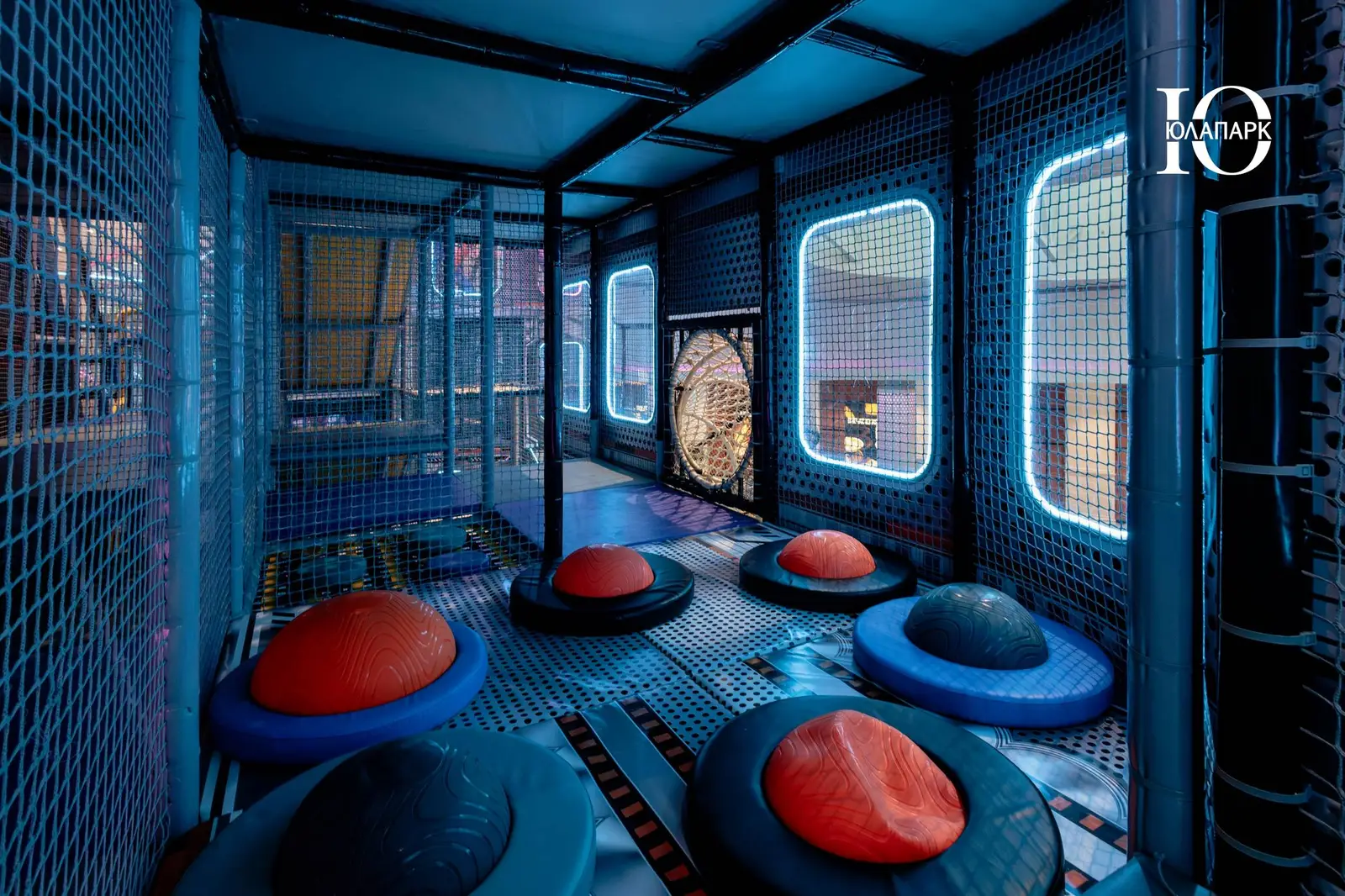Сам парк выполнен в стиле космической станции, где есть две зоны — основная и для малышей. В этот раз мы использовали нетипичную площадь, которую заняли усложненными лабиринтами с препятствиями, высокими горками, игровыми домиками, спортивными зонами, ареной с пушками, а также большим количеством интерактива внутри!