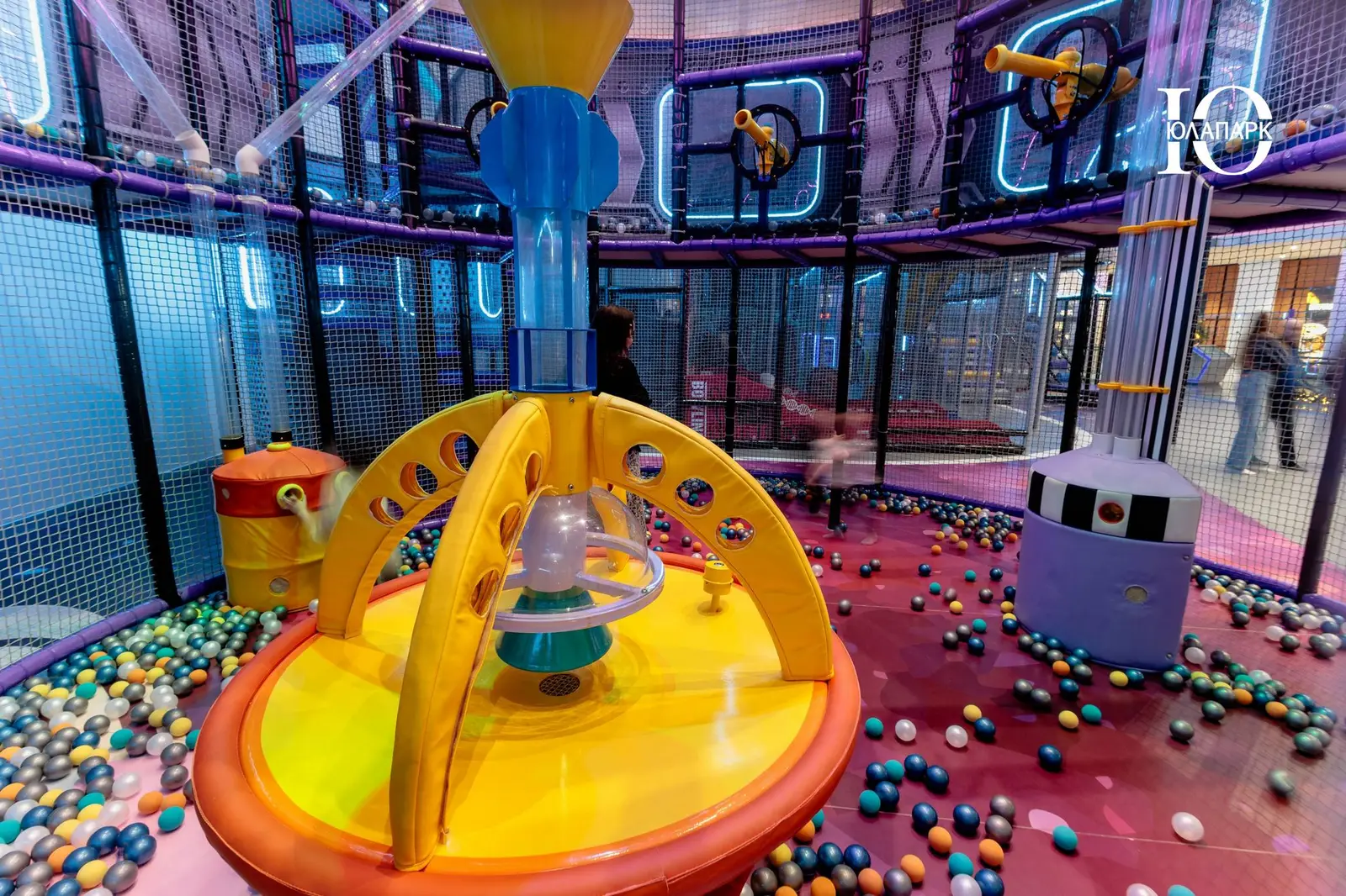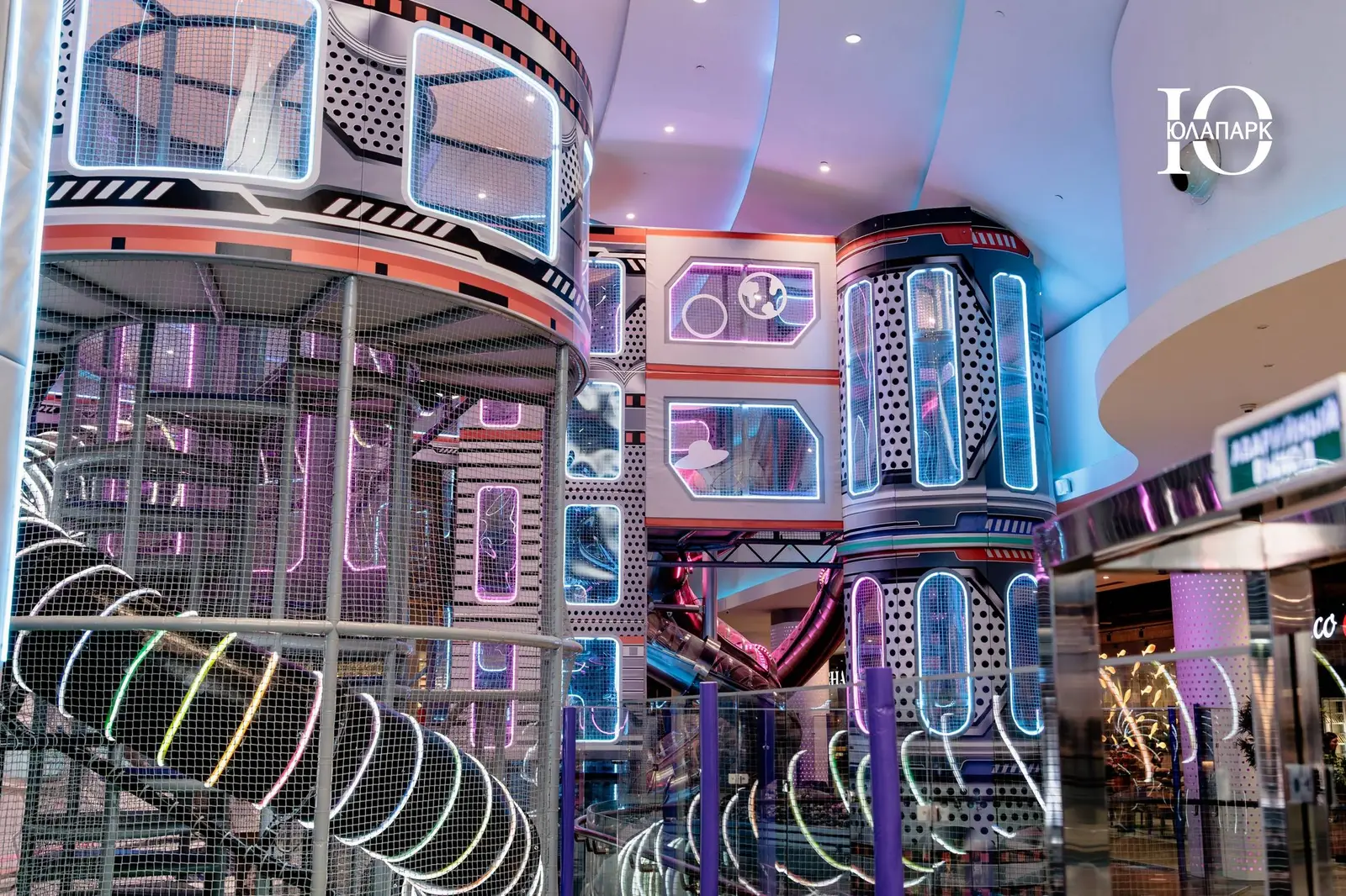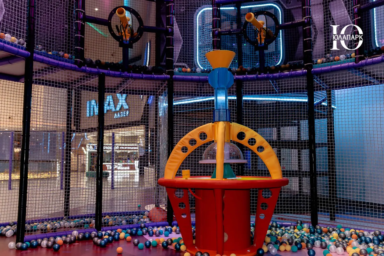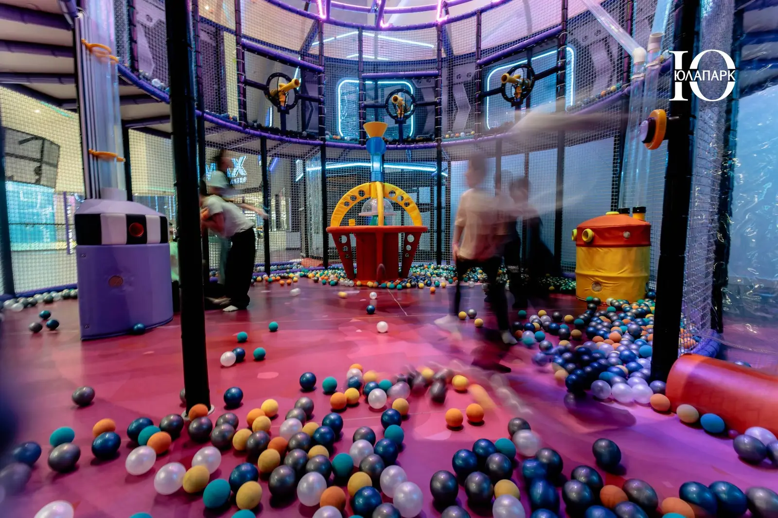 Сам парк выполнен в стиле космической станции, где есть две зоны — основная и для малышей. В этот раз мы использовали нетипичную площадь, которую заняли усложненными лабиринтами с препятствиями, высокими горками, игровыми домиками, спортивными зонами, ареной с пушками, а также большим количеством интерактива внутри!