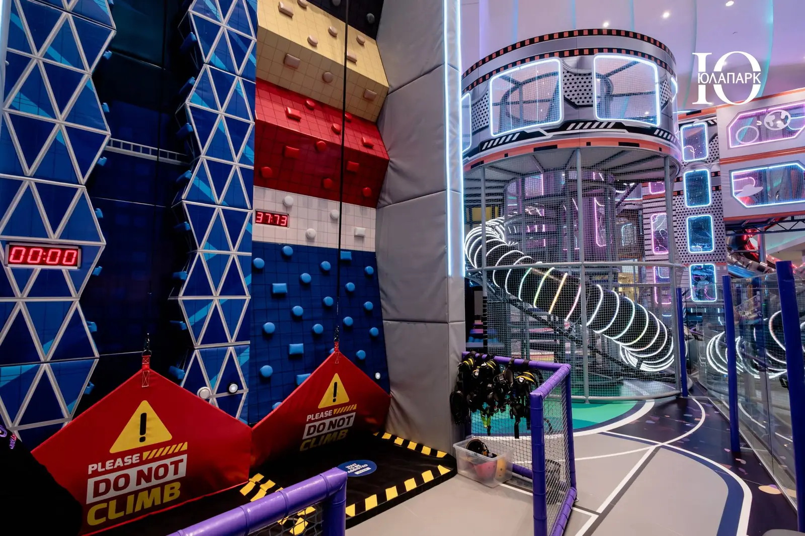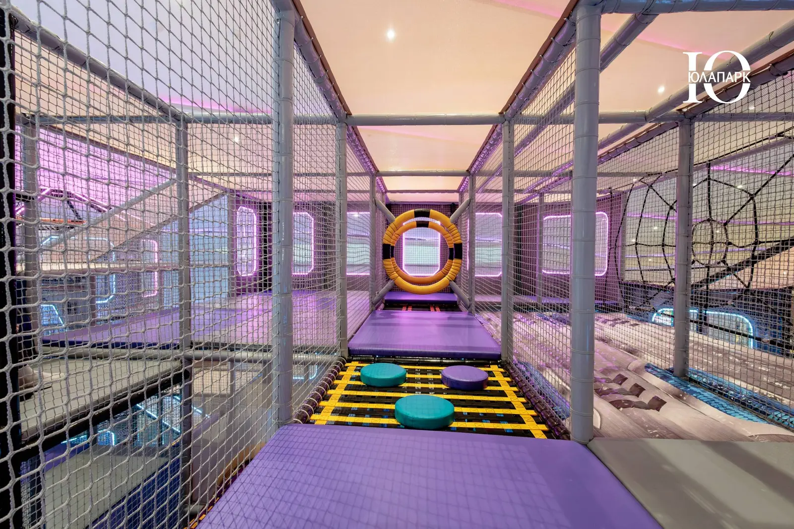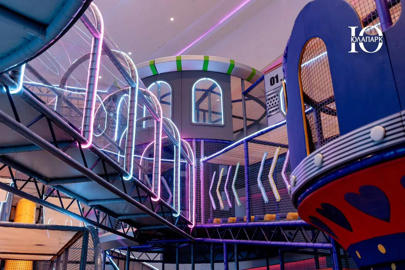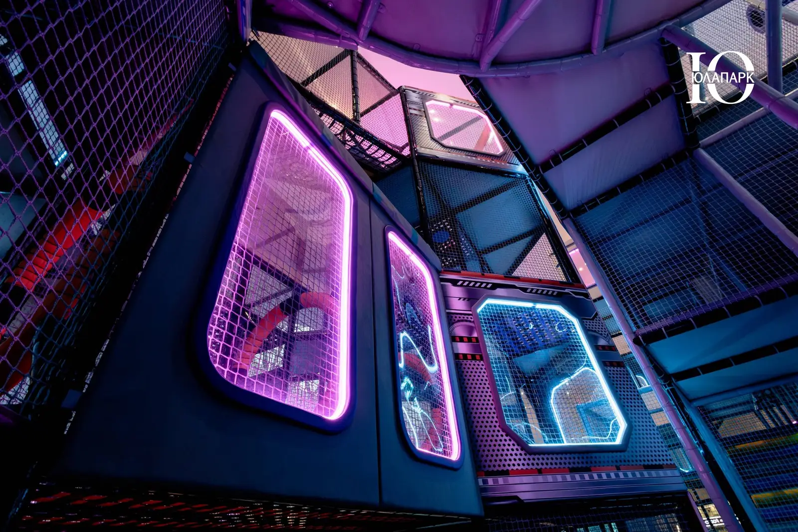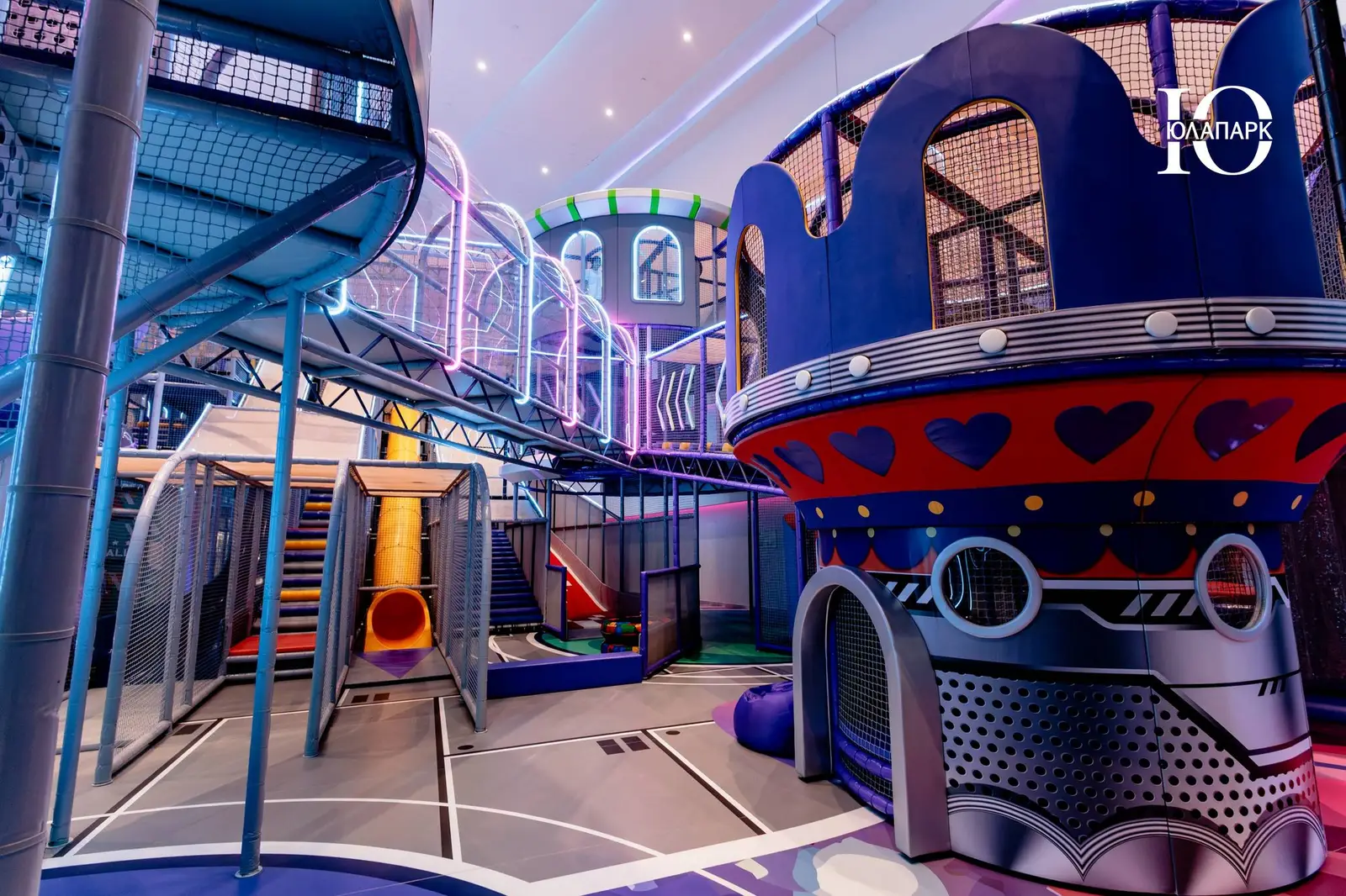 Сам парк выполнен в стиле космической станции, где есть две зоны — основная и для малышей. В этот раз мы использовали нетипичную площадь, которую заняли усложненными лабиринтами с препятствиями, высокими горками, игровыми домиками, спортивными зонами, ареной с пушками, а также большим количеством интерактива внутри!