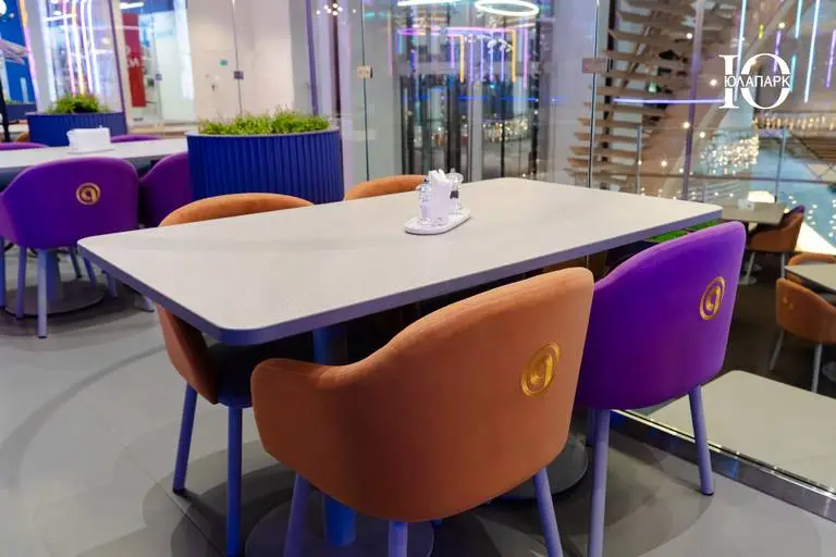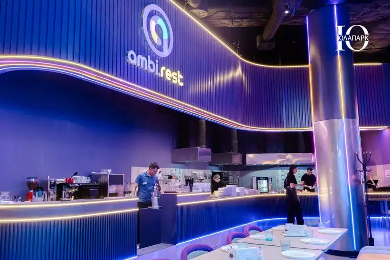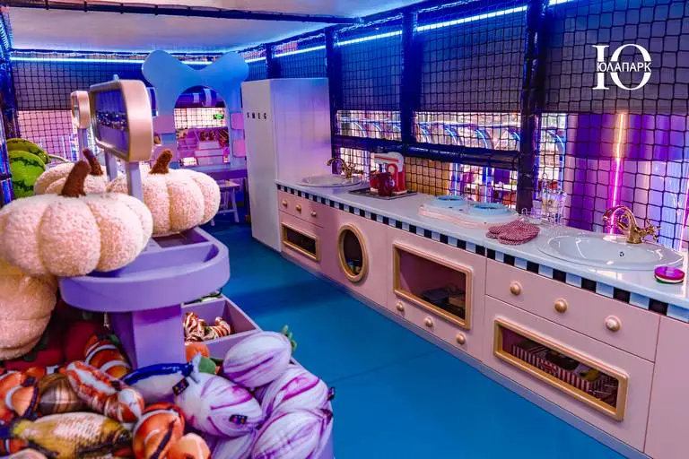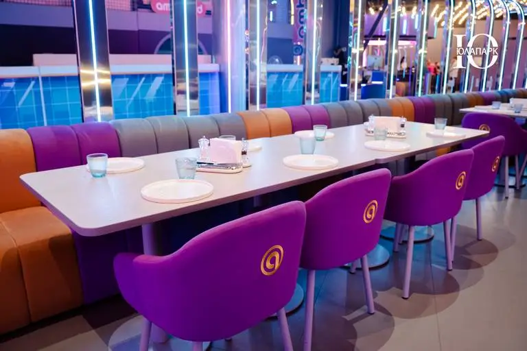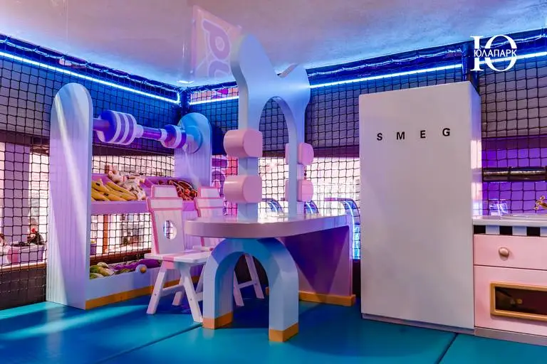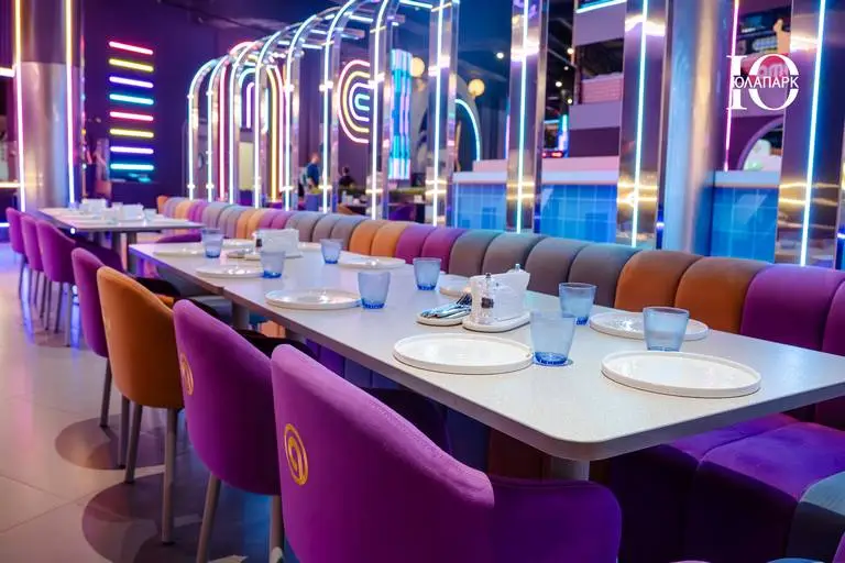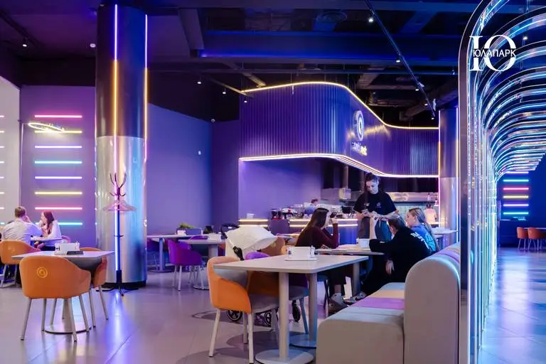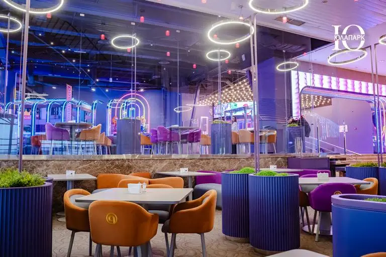 На территории расположен брендированный фирменный ресторан, но уже с открытой кухней для того, чтобы каждый мог наслаждаться процессом приготовления блюд. Концепция ресторана гармонично вписывается в интерьер игровой, что делает весь проект стильным и гармоничным.